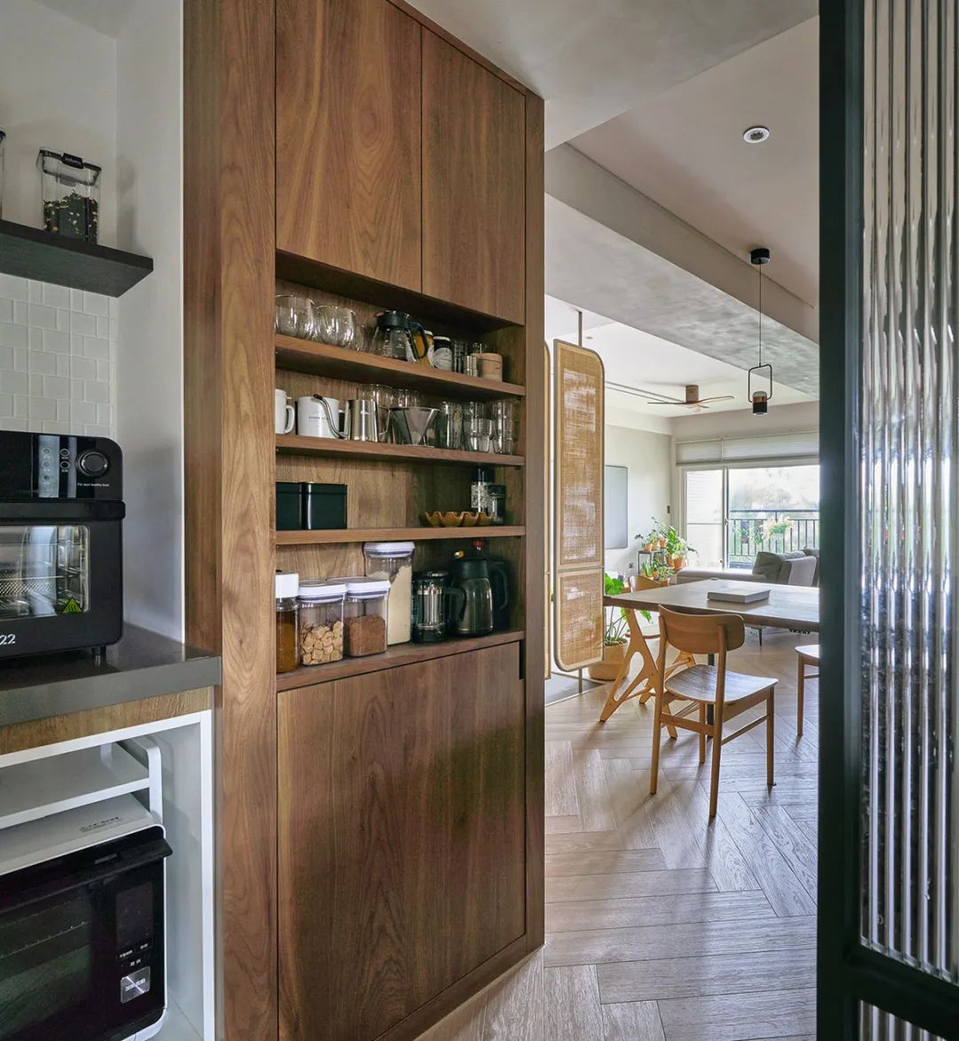 岛台向内延伸,以长虹玻璃为界,以内就是中厨区。L型橱柜+高柜的组合,不仅收纳力满分,日常下厨动线也很流畅自然。