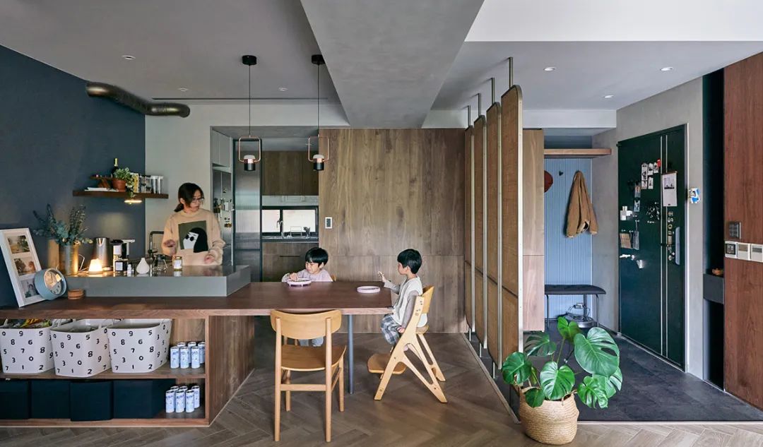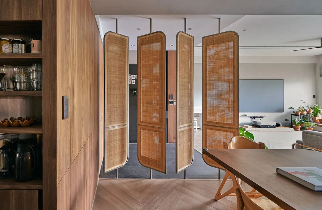 户型开门即餐厅,为了保持一定的私密性,避免“一览无余”,特意在玄关柜一侧设置了4面竹制格栅,隔断颜色与全屋的黑胡桃色系搭配起来也异常和谐。