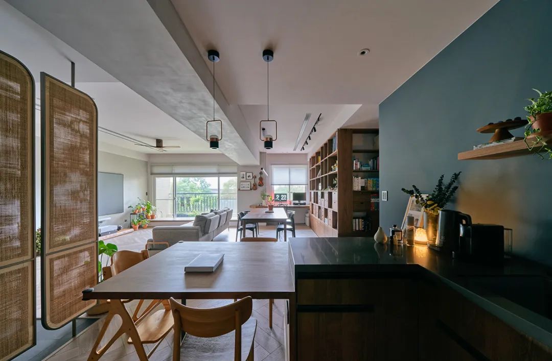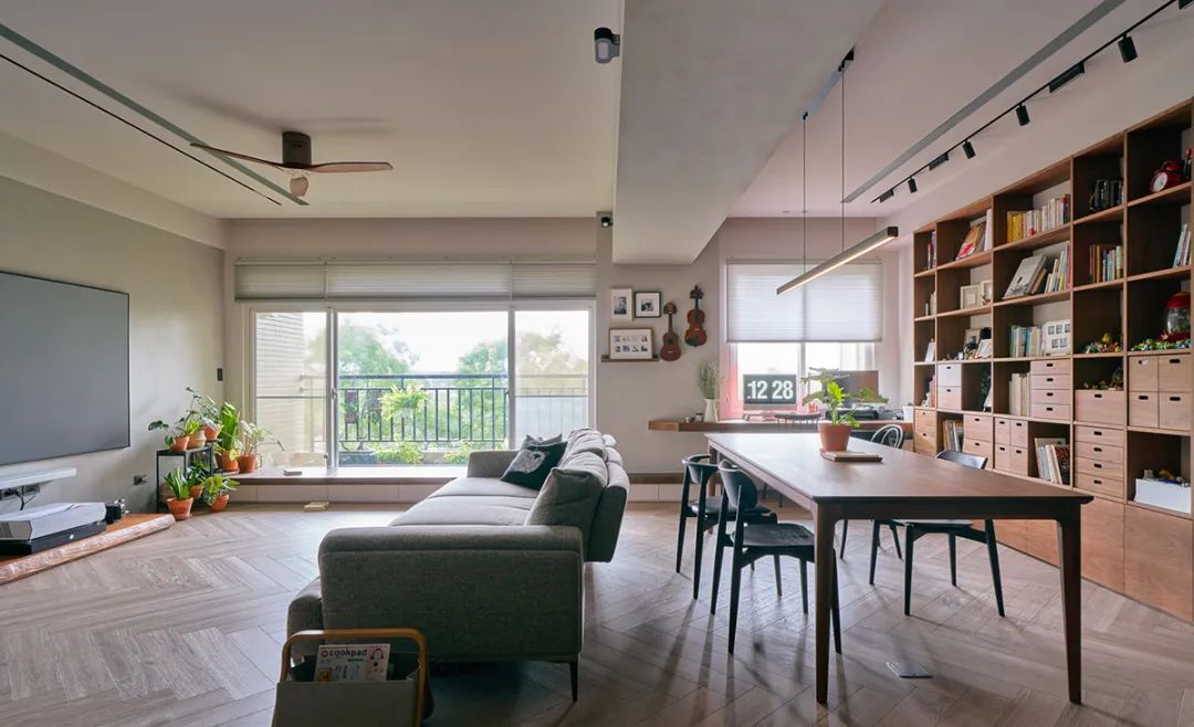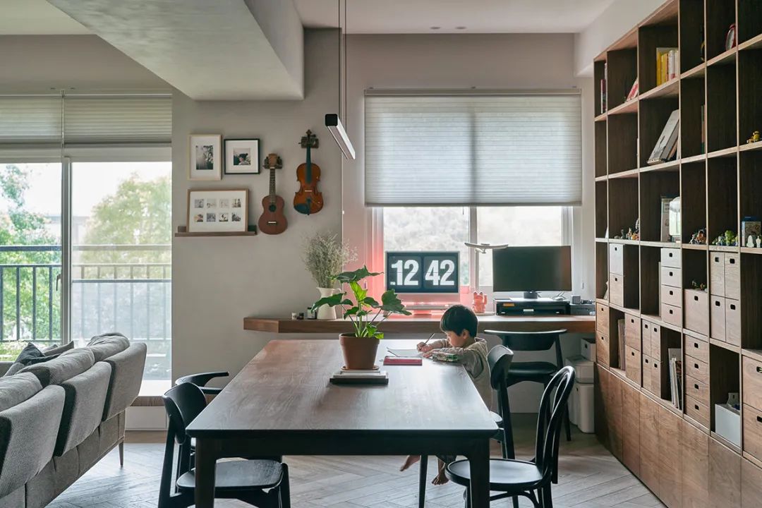 客厅与工作区相连,一侧用无印良品的组装柜构成阅读收纳墙。平时和孩子在这里做做手工,看看书也很惬意。