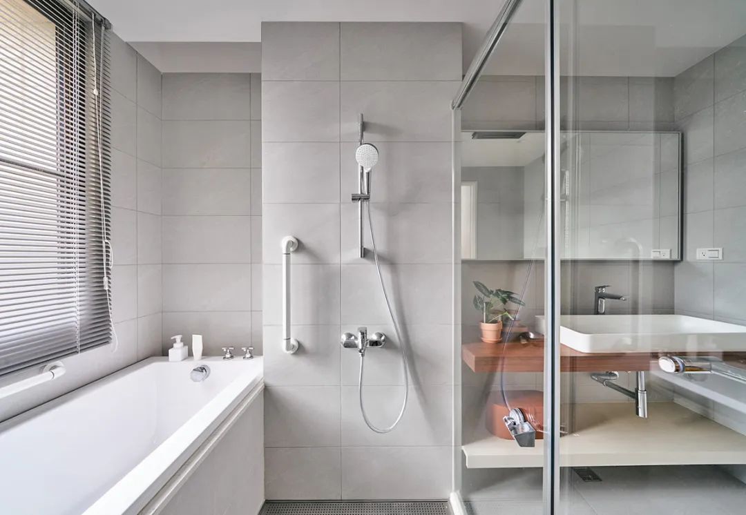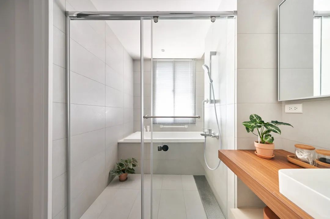 沿袭主卧纯净自然的风格,卫生间也以白色色调为主,实木为洗手台面,因为洗手盆够宽,所以也没有出现过多水渍损伤台面的问题。
