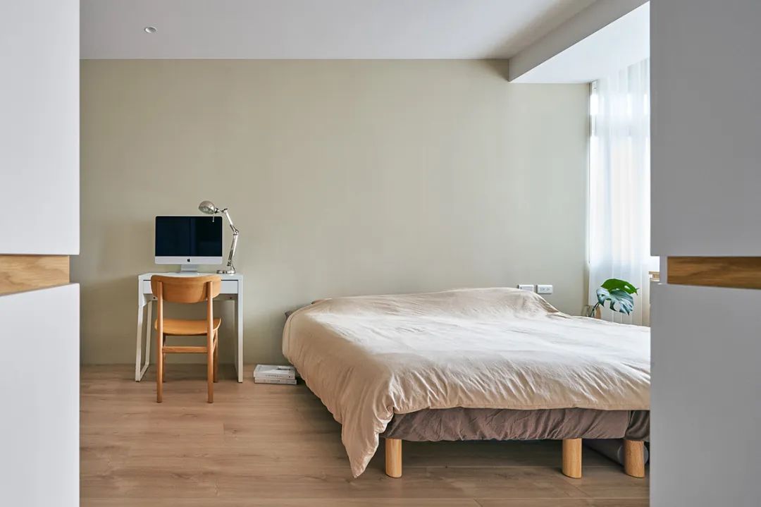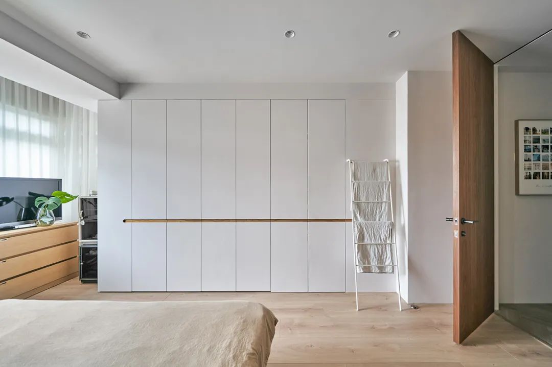 主卧保留屋主原有的浅色五斗柜,配上纯白色衣柜,营造一种干净清新的入睡环境。